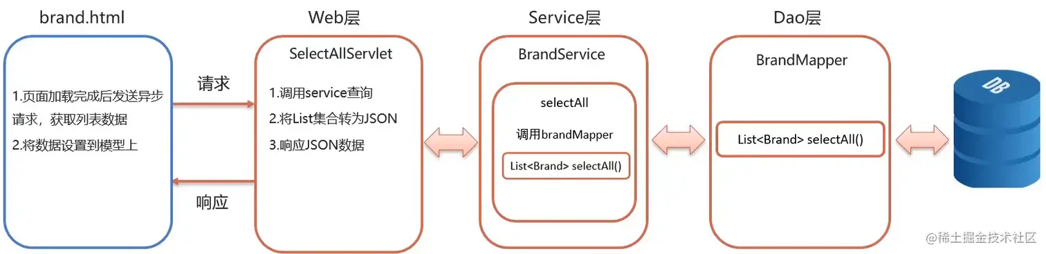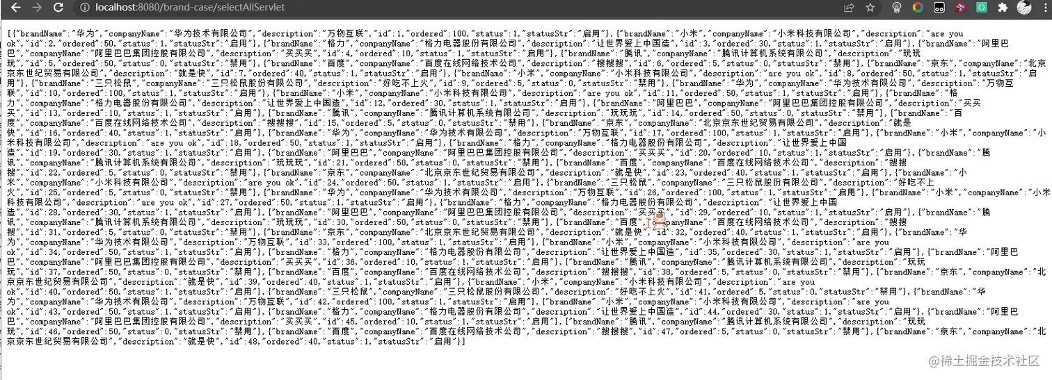 SelectAllServlet.javapackage com.ruochen.web.servlet; import com.alibaba.fastjson.JSON; import com.ruochen.pojo.Brand; import com.ruochen.service.BrandService; import com.ruochen.service.impl.BrandServiceImpl; import javax.servlet.*; import javax.servlet.http.*; import javax.servlet.annotation.*; import java.io.IOException; import java.util.List; @WebServlet("/selectAllServlet") public class SelectAllServlet extends HttpServlet { private BrandService brandService = new BrandServiceImpl(); @Override protected void doGet(HttpServletRequest request, HttpServletResponse response) throws ServletException, IOException { // 1. 调用 service 查询 List<Brand> brands = brandService.selectAll(); // 2. 数据转为 JSON String jsonString = JSON.toJSONString(brands); // 3. 写数据 // 数据存在中文 response.setContentType("text/json;charset=utf-8"); response.getWriter().write(jsonString); } @Override protected void doPost(HttpServletRequest request, HttpServletResponse response) throws ServletException, IOException { this.doGet(request, response); } }- 测试