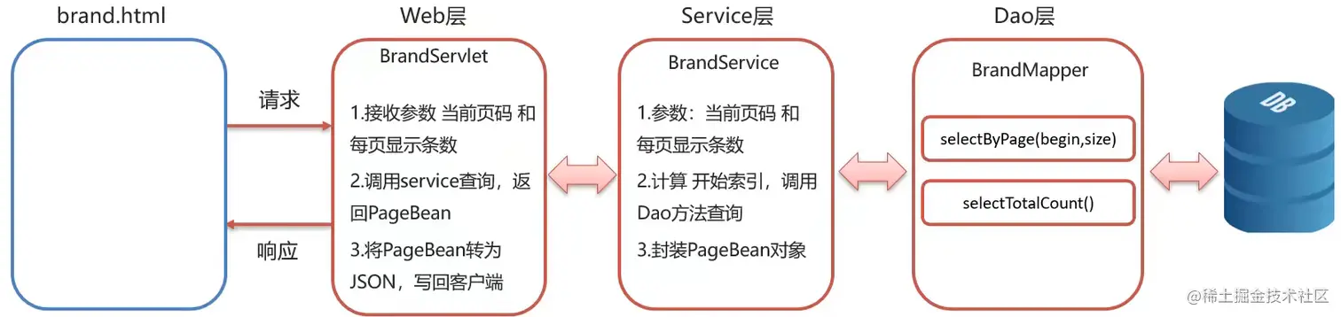@Override public PageBean<Brand> selectByPage(int currentPage, int pageSize) { // 2. 获取 SqlSession 对象 SqlSession sqlSession = factory.openSession(); // 3. 获取 BrandMapper BrandMapper brandMapper = sqlSession.getMapper(BrandMapper.class); // 4. 计算 开始索引 和 查询条目数 int begin = (currentPage - 1) * pageSize; int size = pageSize; // 5. 查询当前页数据 List<Brand> rows = brandMapper.selectByPage(begin, size); // 6. 查询总记录数 int totalCount = brandMapper.selectTotalCount(); // 7. 封装 pageBean 对象 PageBean<Brand> pageBean = new PageBean<>(); pageBean.setRows(rows); pageBean.setTotalCount(totalCount); // 8. 释放资源 sqlSession.close(); return pageBean; } - Service 接口类: