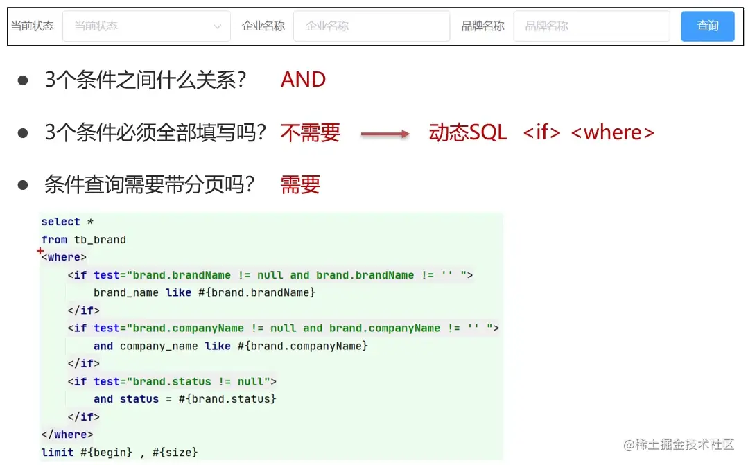 /** * 分页条件查询 * * @param begin 开始索引 * @param size 查询数据条数 * @param brand 查询条件 * @return */ @ResultMap("brandResultMap") List<Brand> selectByPageAndCondition(@Param("begin") int begin, @Param("size") int size, @Param("brand") Brand brand); /** * 根据条件查询总记录数 * * @param brand 查询条件 * @return */ int selectTotalCountByCondition(Brand brand);BrandMapper.xml