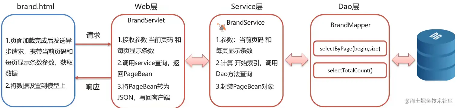 BrandMapper.java/** * 分页查询 * * @param begin 开始索引 * @param size 查询数据条数 * @return */ @Select("select * from tb_brand limit #{begin}, #{size}") @ResultMap("brandResultMap") List<Brand> selectByPage(@Param("begin") int begin, @Param("size") int size); /** * 查询总记录数 * * @return */ @Select("select count(*) from tb_brand") int selectTotalCount(); - Service 层