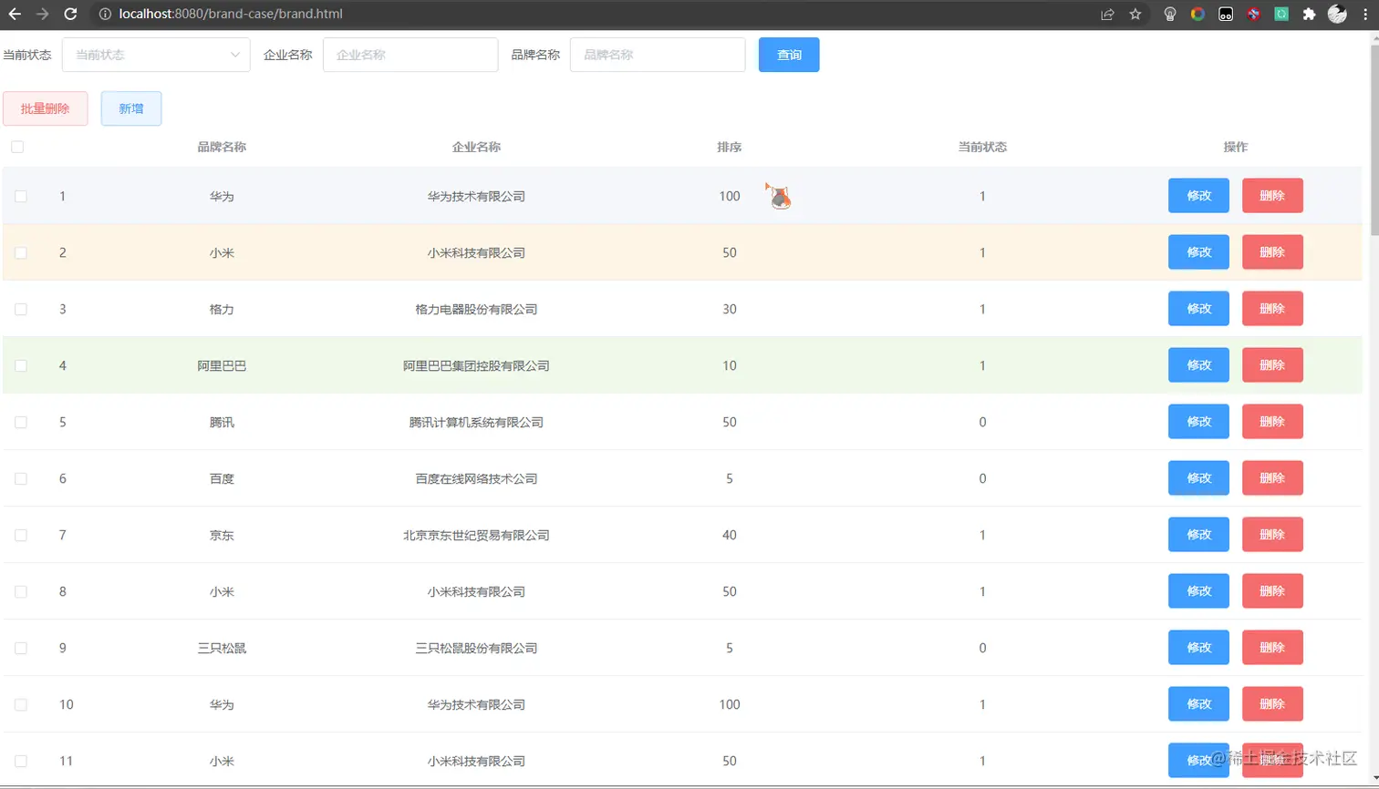tableDatamounted() { // 当页面加载完成后,发送异步请求,获取数据 var _this = this; axios({ method: "get", url: "http://localhost:8080/brand-case/selectAllServlet" }).then(function (resp) { _this.tableData = resp.data; }) }, - 测试