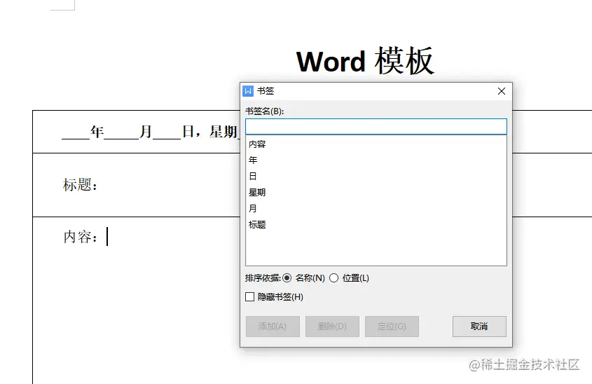 然后在想填充数据的地方添加书签,如下图,光标在年的前方,点击上方的书签按钮。