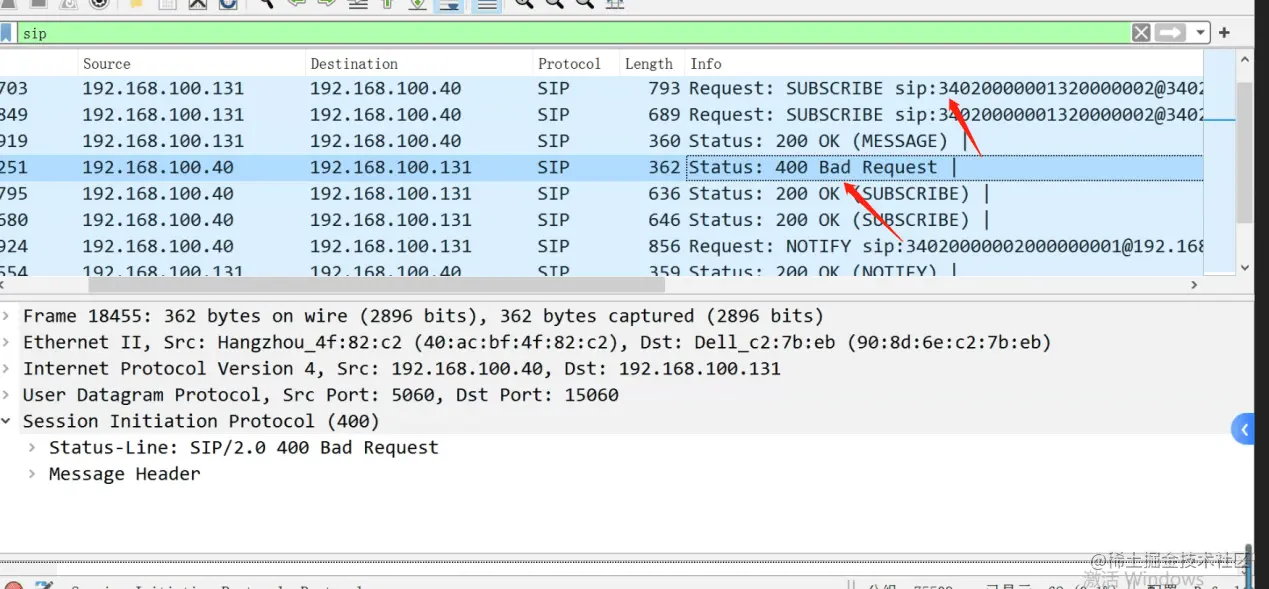 随后在服务器上抓包,通过抓包可以看到,平台已经发送了订阅告警的消息,由于设备端给平台返回400 bad request,才导致无法上传告警信息。随后技术人员与海康技术人员沟通,修改其订阅消息的逻辑即可。