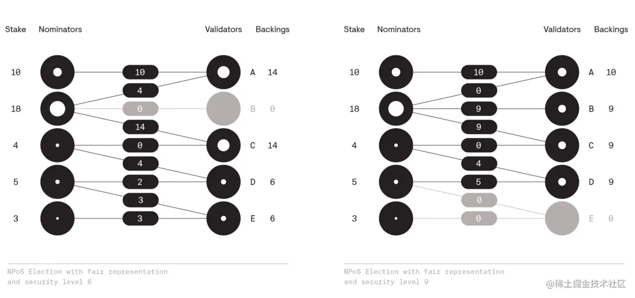 这个方案允许大量的质押( stake )来支持验证人,远远高于任何单个用户的持有量,从而使网络更加安全。提名人与他们支持的验证人分享经济奖励以及可能的 Slash 惩罚( Slash 惩罚:当验证者在网络中有一些不当行为,例如离线、攻击网络以及运行修改过的软件等,被 Slash 的验证者会和他们的提名者一起失去一定比例的质押的 DOT),在经济上给予系统安全性,因此在经济上激励他们监督验证人的性能。