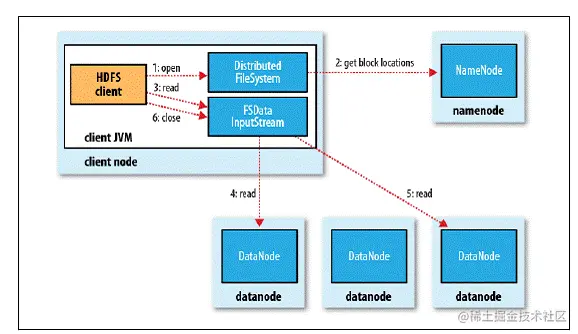 4、存储着文件起始块的DataNode地址的DFSInputStream随即连接距离最近的DataNode,通过对数据流反复调用read()方法,可以将数据从DataNode传输到客户端;