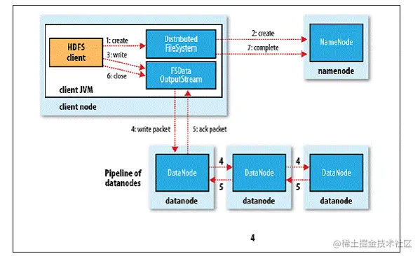 3、前两步结束后会返回FSDataOutputStream的对象,和读文件的时候相似,FSDataOutputStream被封装成DFSOutputStream,DFSOutputStream可以协调NameNode和Datanode。客户端开始写数据到DFSOutputStream,DFSOutputStream会把数据切成一个个小的数据包,并写入内部队列称为“数据队列”(Data Queue);