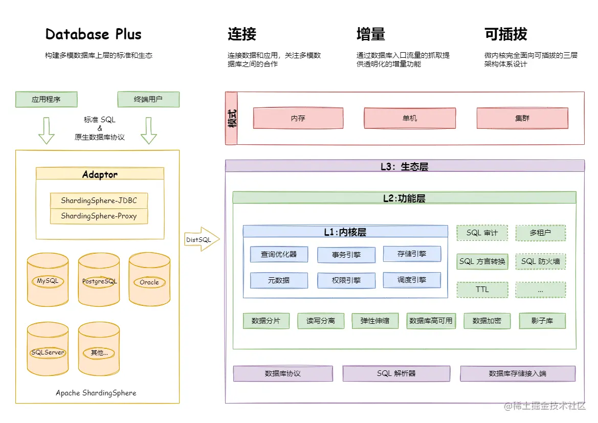 - 增量:获取数据库的访问流量,并提供流量重定向(数据分片、读写分离、影子库)、流量变形(数据加密、数据脱敏)、流量鉴权(安全、审计、权限)、流量治理(熔断、限流)以及流量分析(服务质量分析、可观察性)等透明化增量功能;