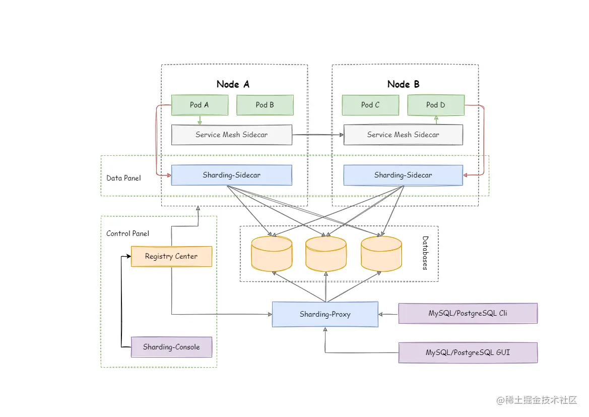 - 定位为 Kubernetes 的云原生数据库代理,以 Sidecar 的形式代理所有对数据库的访问。 通过无中心、零侵入的方案提供与数据库交互的啮合层,即 Database Mesh,又可称数据库网格。