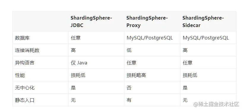 - Apache ShardingSphere 由 JDBC、Proxy 和 Sidecar(规划中)这 3 款既能够独立部署,又支持混合部署配合使用的产品组成。 它们均提供标准化的基于数据库作为存储节点的增量功能,可适用于如 Java 同构、异构语言、云原生等各种多样化的应用场景。