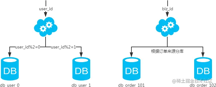 - 以字段为依据,按照一定策略(hash、range等),将一个库中的数据拆分到多个库中。