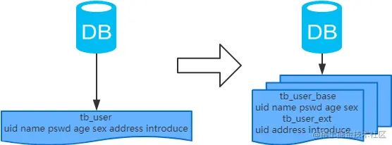 - 以字段为依据,按照字段的活跃性,将表中字段拆到不同的表(主表和扩展表)中。