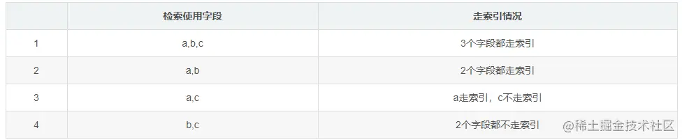 情况1和2,因为你符合最左匹配原则,所以使用的字段都会走索引。情况3,由于没有连续使用索引字段,跳过了b,所以只有a走索引,c不会走索引。第4种情况,由于最左侧的a没有作为检索字段,所以b,c都不会走索引。