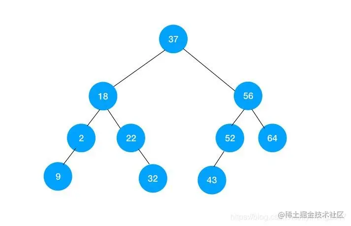 可以看到以上二叉树中查找52的过程也是三步,查找路径是37->56->52。 这和二分查找法完全一样。这是因为这棵二叉树额外满足了其他的一些条件。