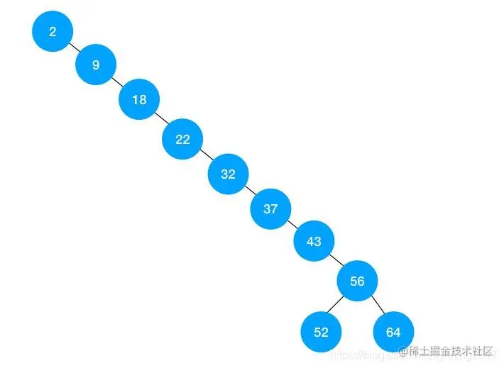 可以看到这次的二叉树直到第8层才有了左侧子树。1到7层虽然也满足二叉树的定义,但实际上已经退化为链表。用这个二叉树进行查找,效率几乎和顺序查找一样了。