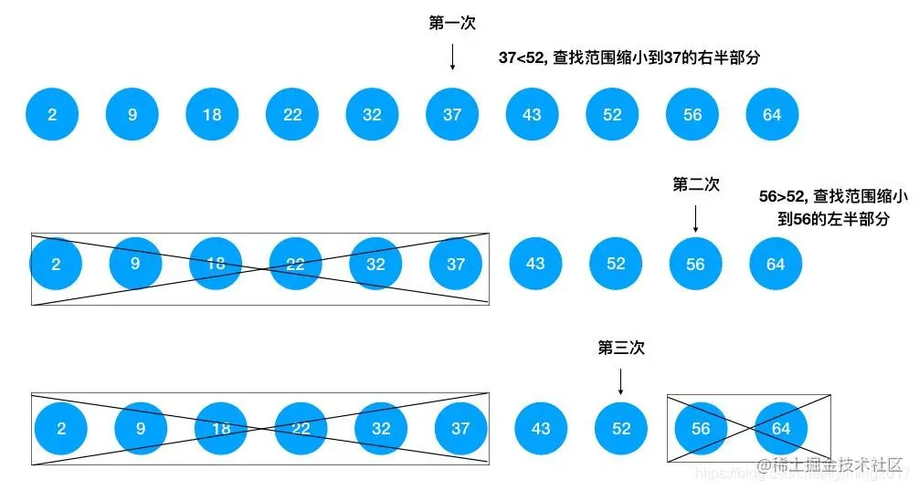 我们以下图为例,看看用二分查找法查找 52 所在位置的过程:\