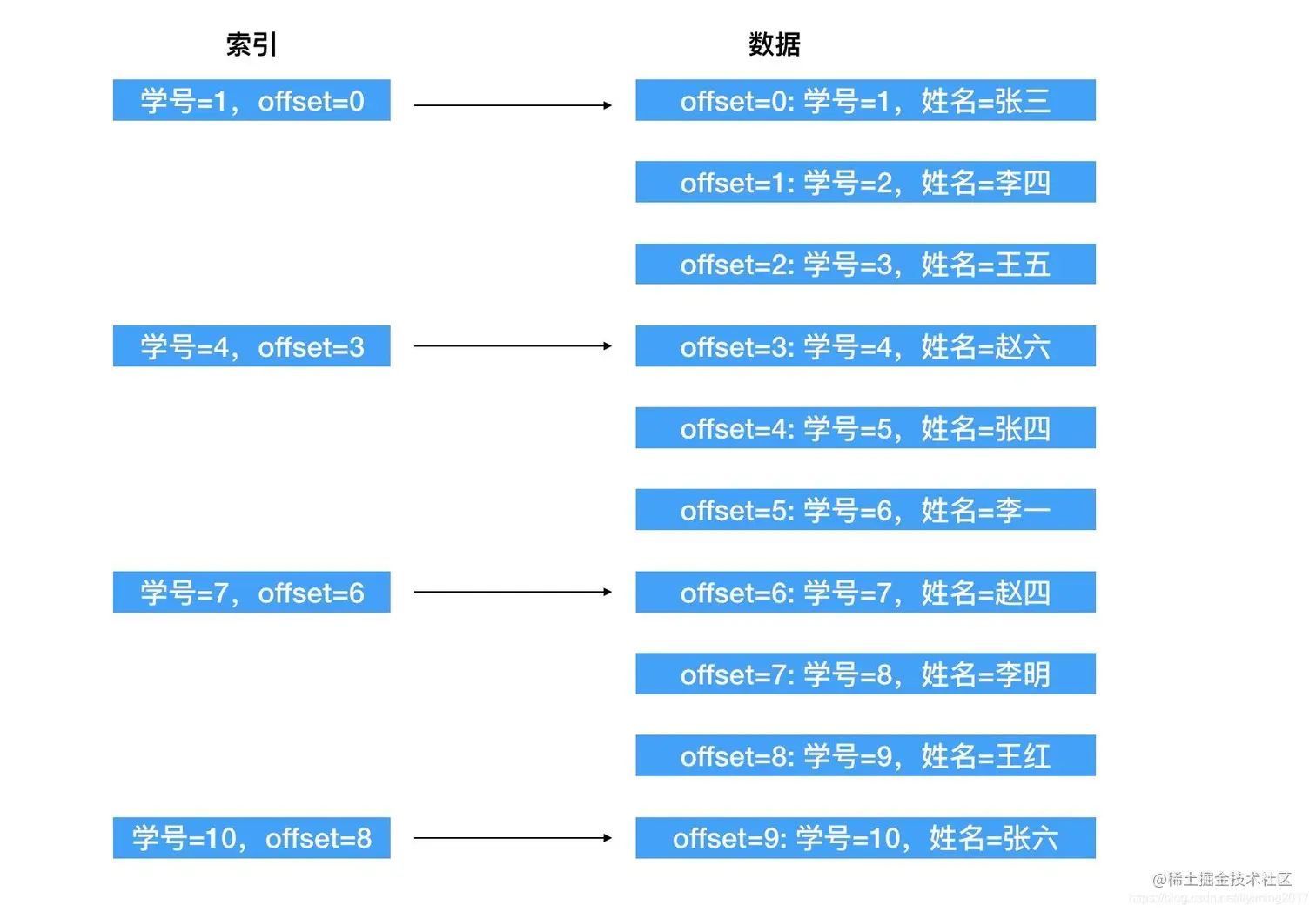 如果我们按照3为步长来索引这10名学生(稀疏索引),那么索引如下:\