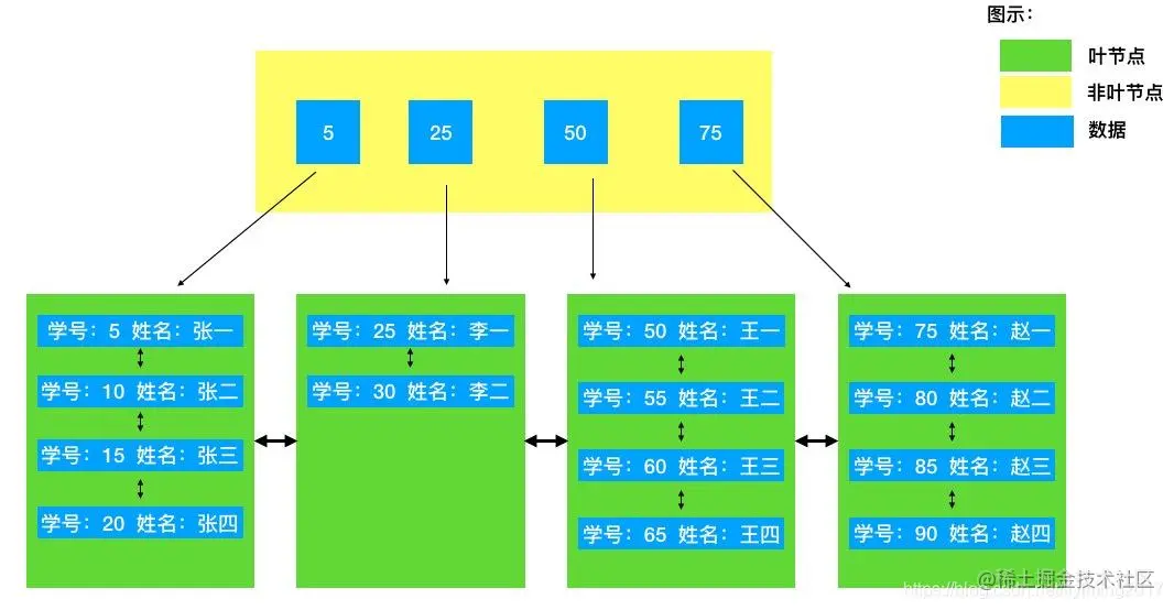 可以看到非叶子节点存储的只是索引键值(学号)以及子节点的指针。完整数据存储在叶子节点中。叶子节点中的数据是按照顺序排列的。叶子节点存储完整数据,非叶子节点则是构造的索引值的平衡树。对于给定的索引值,可以通过B+树快速定位到叶子节点。然后在叶子节点内部再次定位到完整的一行数据。