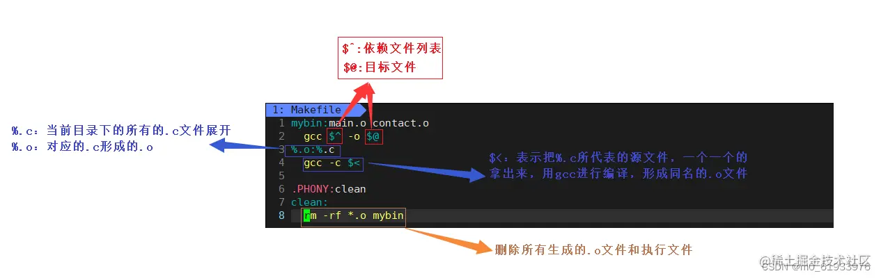 mybin:main.o contact.o 2 gcc $^ -o $@ 3 4 %.o:%.c 5 gcc -c $< 6 7 .PHONY:clean 8 clean: 9 rm -rf *.o mybin