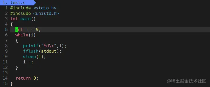 #include <stdio.h> 2 #include <unistd.h> 3 int main() 4 { 5 int i = 9; 6 while(i) 7 { 8 printf("%d\r",i); 9 fflush(stdout); //刷新缓存 10 sleep(1); 11 i--; 12 } 13 14 return 0; 15 }