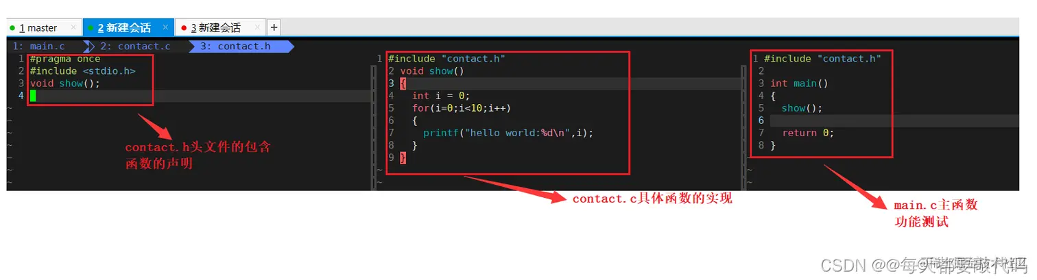 ❤️我们不妨写一个小代码,就简单打印10遍hello world吧!我们把这个程序的实现写成项目的模式:contact.h表示头文件的包含,函数的声明等、contact.c具体函数的实现、main.c主函数和测试功能: