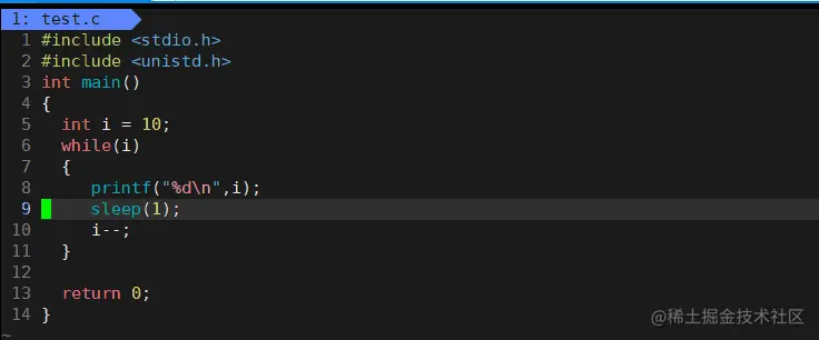 #include <stdio.h> 2 #include <unistd.h> 3 int main() 4 { 5 int i = 10; 6 while(i) 7 { 8 printf("%d\n",i); 9 sleep(1); 10 i--; 11 } 12 13 return 0; 14 }