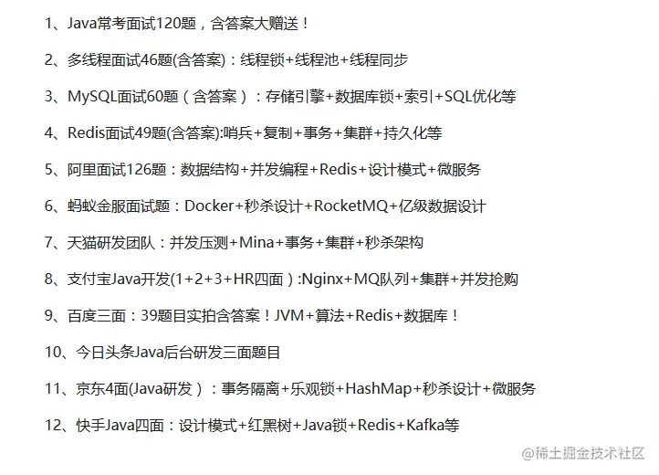 涵盖内容:Java常考题目、JVM、多线程、MySQL、Redis、Kafka、Docker、RocketMQ、Nginx、MQ队列、数据结构、并发编程、并发压测、秒杀架构等。