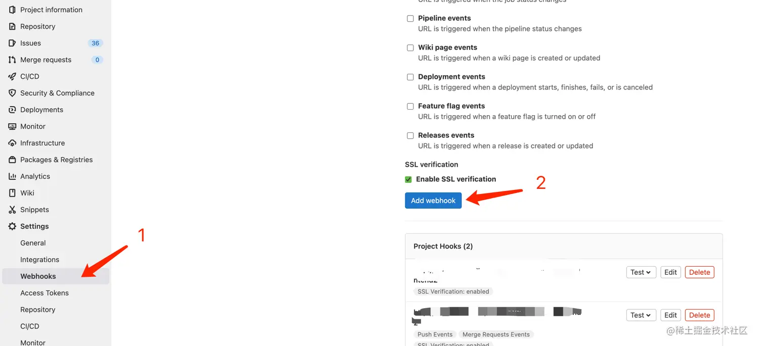 - 复制将建木webhook地址加入gitlab项目webhooks中(一定要选merge request 方式触发哟!)