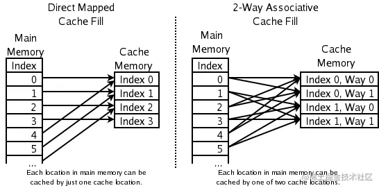 - 一种方法是,任何一个内存地址的数据可以被缓存在任何一个Cache Line里,这种方法是最灵活的,但是,如果我们要知道一个内存是否存在于Cache中,我们就需要进行O(n)复杂度的Cache遍历,这是很没有效率的。