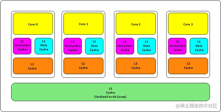 首先,我们都知道现在的CPU多核技术,都会有几级缓存,老的CPU会有两级内存(L1和L2),新的CPU会有三级内存(L1,L2,L3 ),如下图所示: