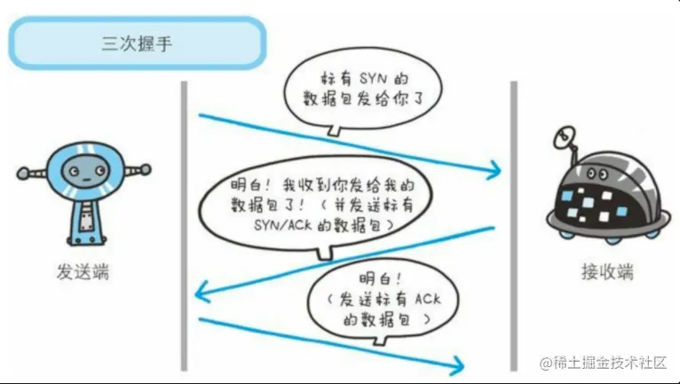 为了确保数据准确传输,整个TCP还需要依赖三次握手,关于三次握手的过程这里也不做过多讨论,可以看《网络是怎么样连接的》读书笔记内容。