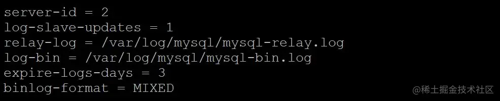 - relay-log:– 从会读取它自己的relay log, 并且应用复制过来的命令到它自己的数据库中。舍不设置它并不重要因为服务器自己会创建relay log,但是我总是显式设置它,这样我就能确保这些日志文件输出到哪里。当然需要确保运行mysql的账号要有写入这个文件夹的权限。