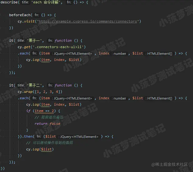 - 若想在 .each() 命令后继续操作原始数组(未遍历前),可以直接在 .each() 命令后接 .then() 命令进行操作
