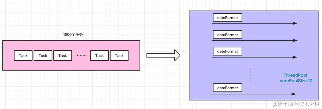 public class ThreadLocalUsage02 { public static ExecutorService THREAD_POOL = Executors.newFixedThreadPool(10); static SimpleDateFormat DATE_FORMAT = new SimpleDateFormat("yyyy-MM-dd HH:mm:ss"); public static void main(String[] args) throws InterruptedException { for (int i = 0; i < 1000; i++) { int finalI = i; THREAD_POOL.submit(new Runnable() { @Override public void run() { String date = new ThreadLocalUsage02().date(finalI); System.out.println(date); } }); } // 关闭线程池,此种关闭方式不再接受新的任务提交,等待现有队列中的任务全部执行完毕之后关闭 THREAD_POOL.shutdown(); } private String date(int seconds) { // 参数的单位是毫秒,从1970.1.1 00:00:00 GMT计时 Date date = new Date(1000 * seconds); return DATE_FORMAT.format(date); }}