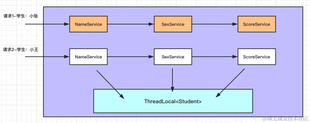 上面的代码就省去了频繁的传递参数,也没有使用到锁机制,同样满足了需求,思想其实和上面将学生信息存储到Map中的思想差不多,只不过这里不是将学生信息存储到Map中,而是存储到了ThreadLocal中,原理图如下所示: