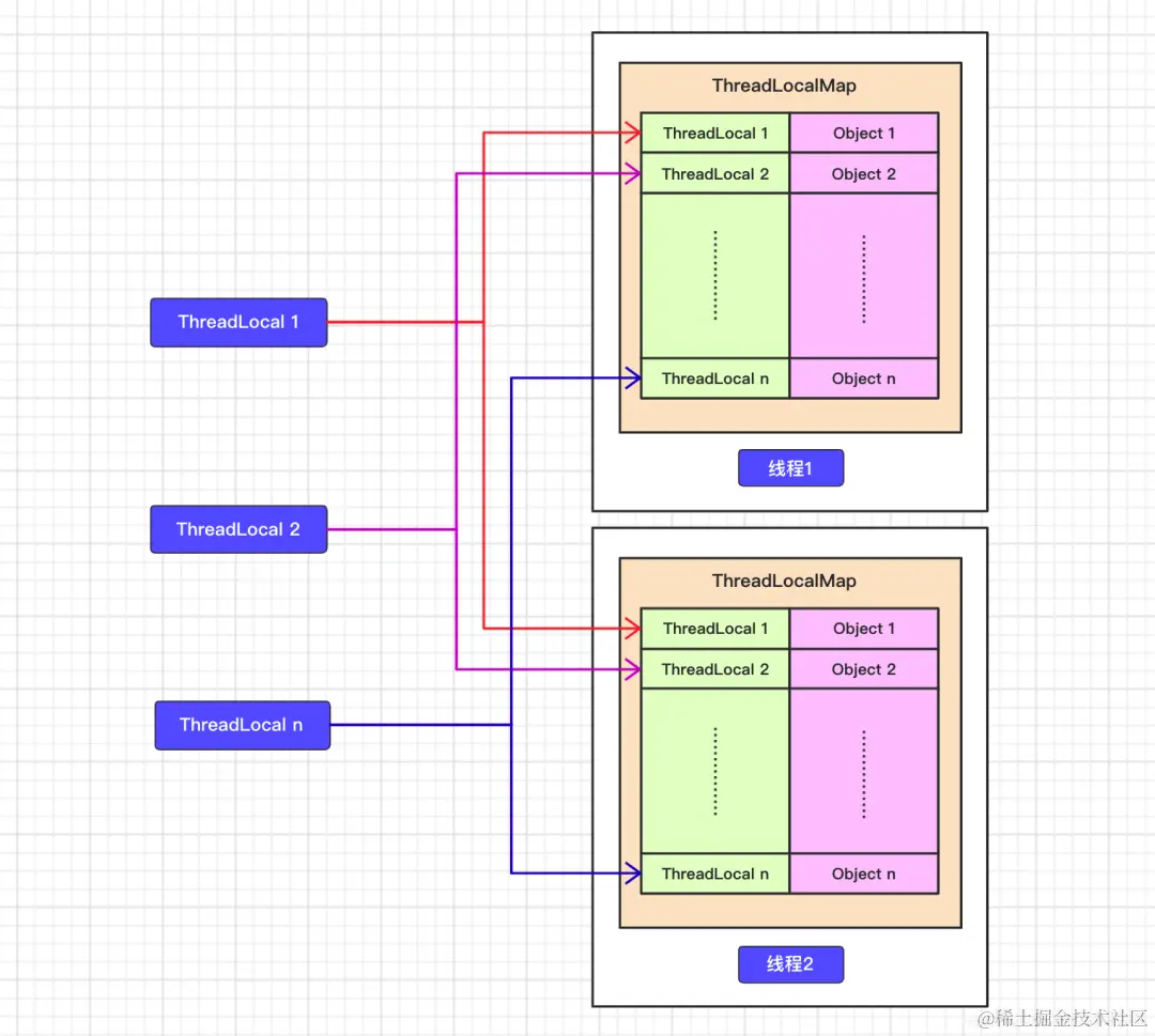 - 场景二:如果多个线程中存储不同的信息,为了方便在其他方法里面获取到信息,那么这种场景适合使用set()方法。例如,在拦截器生成的用户信息,用ThreadLocal.set直接放入到ThreadLocal中去,以便在后续的方法中取出来使用。