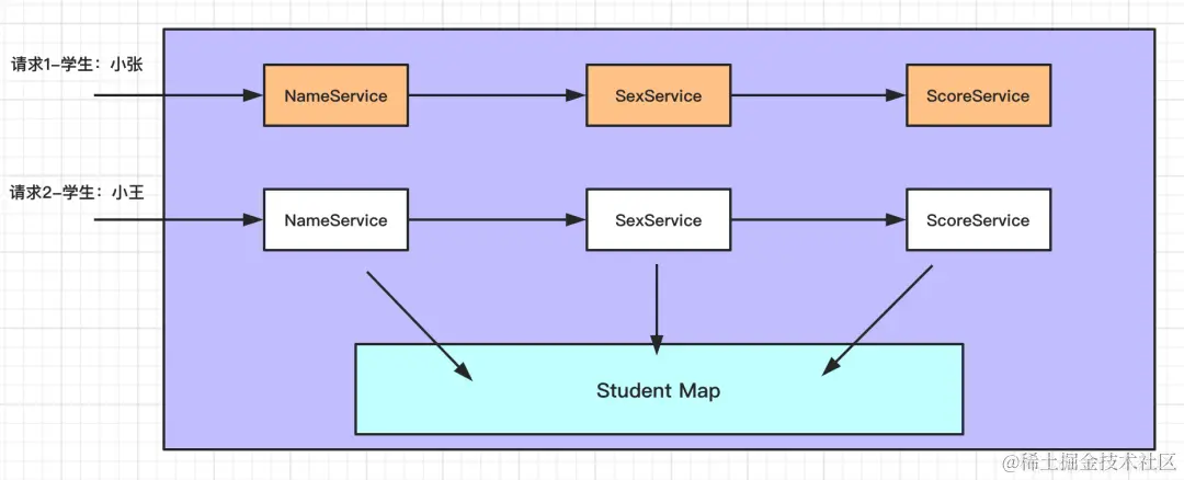 也许有人会说,我们可以将学生信息存入到一个共享的Map中,需要学生信息的时候直接去Map中取,如下图所示: