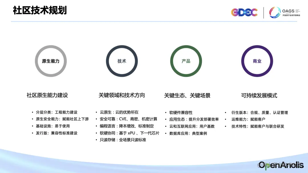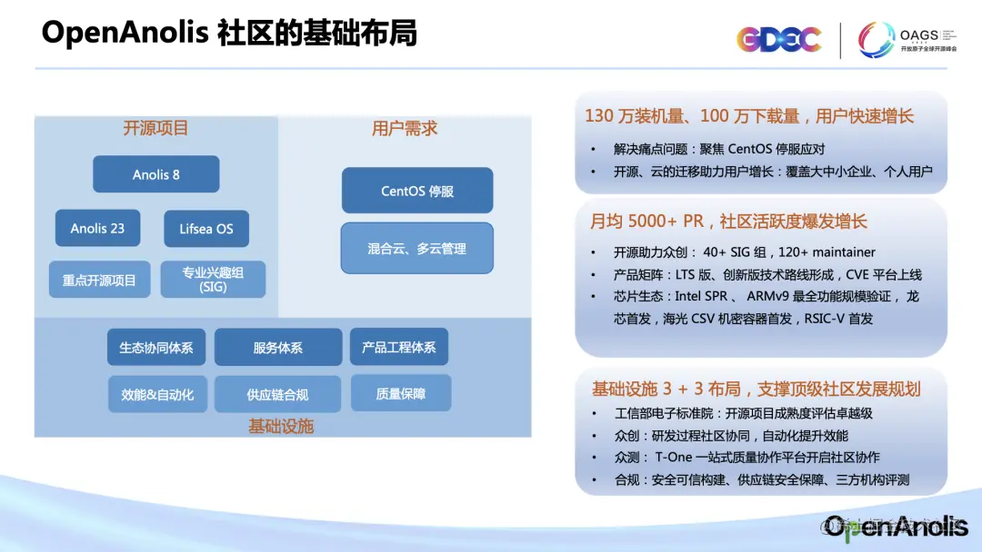 第三:全面支持下一代数据中心芯片,在技术上我们希望实现 Anolis OS 23 面向未来的布局,产品化迭代节奏实现业内领先。