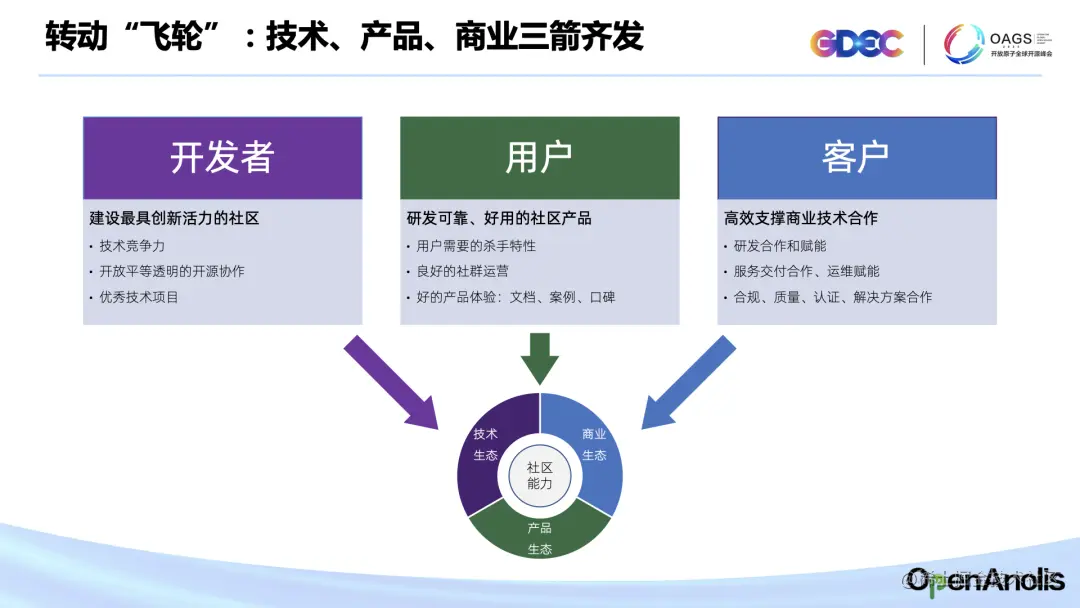 那么,我们如何衡量一个开源技术社区的进步呢?实际上,开源技术社区的进步很难像管理一家公司一样,用 KPI 来驱动。所以我们认为最佳的衡量手段就是当下是否把事情做对了,是不是在一个正反馈里面。在新的一年规划里,龙蜥社区将从开发者、用户和客户的三方面去思考这个问题。由于操作系统是一个存量的成熟的产品品类,所以过去一年龙蜥社区首要任务是深耕产品,满足客户和用户的需求,围绕需求建立社区价值,近一步放大开发者价值,致力于建设一个极具创新活力的社区。跟大家分享一个小故事,最近我在一个业界技术交流群里看到有人反馈说使用龙蜥的体验非常好,然后我就加了这位同学好友进一步交流,了解得知这位同学不但是龙蜥社区的交流群中的活跃开发者,还是拥有着产品需求的种子用户。由此我认为通过研发可靠好用的社区产品,让用户成为我们的产品经理,然后从用户需求中探索社区发展方向,可以进一步支撑起客户侧的商业技术合作,“技术生态”、“产品生态”和“商业生态”组成龙蜥社区不断转动前进的“飞轮”,给品牌和社区带来更多的竞争力。