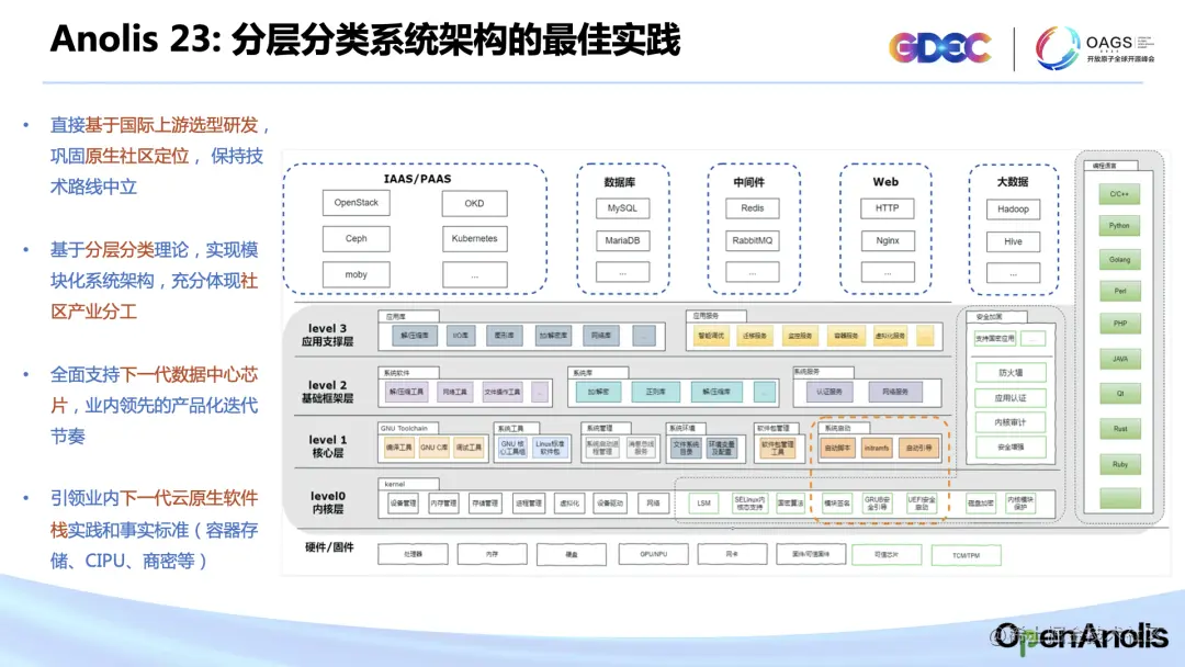 Anolis OS 23 正是分层分类系统架构的最佳实践。其实操作系统的选型是一个非常大的话题和工程,从整体系统的构建、原创技术的研发、行业标准的打造,整体工程通过 SIG 来承接,形成一套比较完善的布局。就 Anolis OS 23 来说,我认为有四大重点: