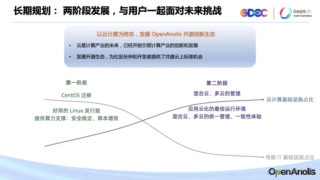 我们认为今天操作系统的整个技术规划要面向未来去考虑。首先,龙蜥社区给用户提供一个好用的可用的 Linux 发行版来支撑现在的算力,更要考虑在云计算发展驱使下未来用户怎么管理数据中心,怎么做好一体化管理。今天的用户已经出现了在虚拟机、裸金属、物理机里面统一多云管理,包括编程语言和云原生的编程模式,这都是操作系统社区应该考虑的课题。龙蜥开源操作系统社区将以云计算为终态,发展开源创新生态,为社区伙伴和开发者提供共建云上标准机会,与用户一起面对未来挑战。