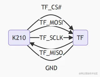 该处改用了 TF卡 的 SPI 操作模式进行接口连接,最终跟 WIFI 的 SPI 接口,分别作为 SPI 的 slave 从机,而 K210 作为 SPI 的 master 主机,同时 master 通过 TF_CS 片选线联通 TF 卡,之后继续相应的通信。