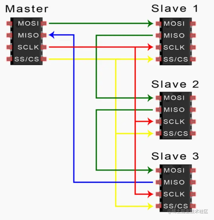 一种全双工双向传输的通用串行数据总线,同步通信,时钟信号由 Master 生成,也就是主设备。SPI 中只有一个主设备 Master 以及 多个从设备 Slave。