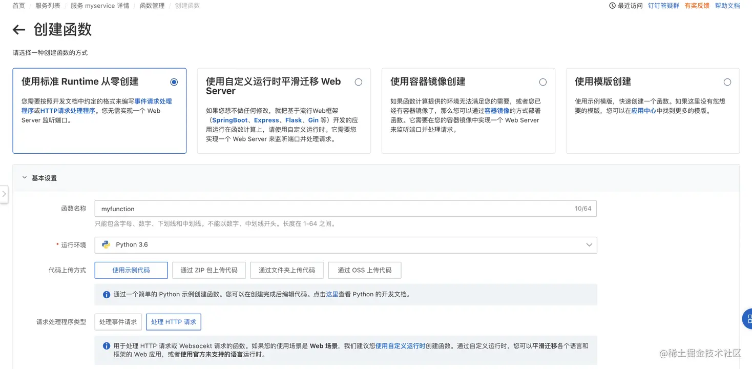 - 函数计算所特有的 HTTP 函数,可以轻松地将 Web 应用迁移部署到 Serverless 架构,但是 HTTP 函数和时间触发器没办法一同配置;