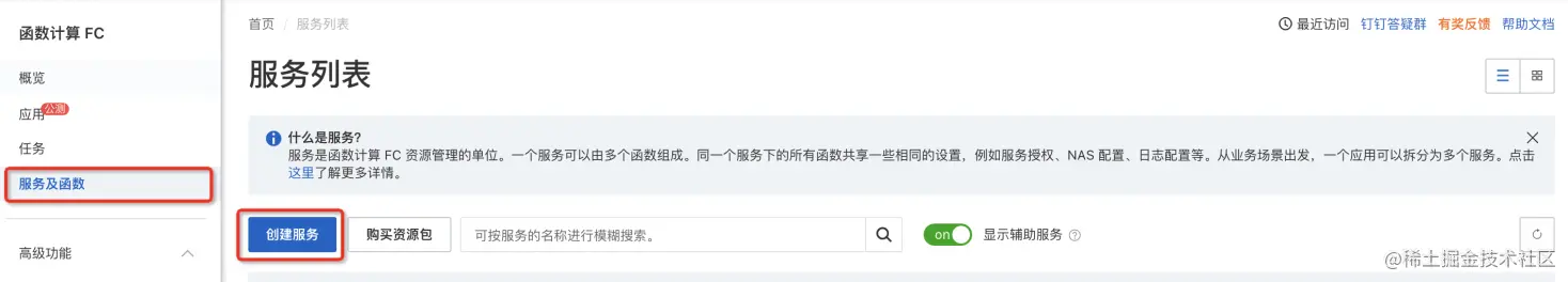 即,开发者只需要完成代码的开发和部署,即可实现业务的弹性伸缩和按量付费能力的夹持,这也符合 CNCF 在白皮书中对 Serverless 架构流程定义的规范。通过阿里云函数计算控制台可以快速进行这个流程的体验,点击“服务及函数”选项,就可以看到服务列表: