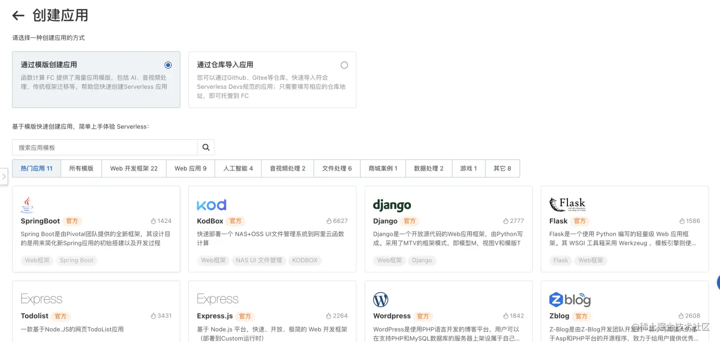 通过应用创建页面,可以快速体验 Serverless 应用: