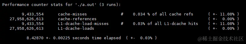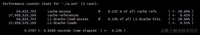 $ sudo perf stat -r 3 -e cache-misses,cache-references,L1-dcache-load-misses,L1-dcache-loads ./a.out