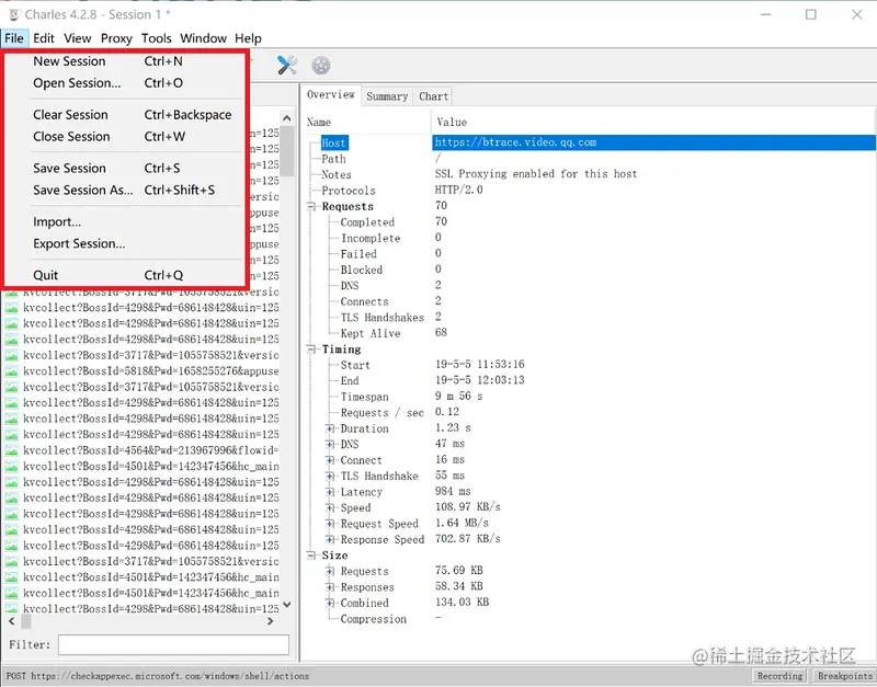 Charles 可以存储各种网络请求信息,所有的请求和响应都会记录到 session 中,可以进行检查和分析。打开菜单栏中的File,在这里管理 session,包括新建、打开、清空等等。