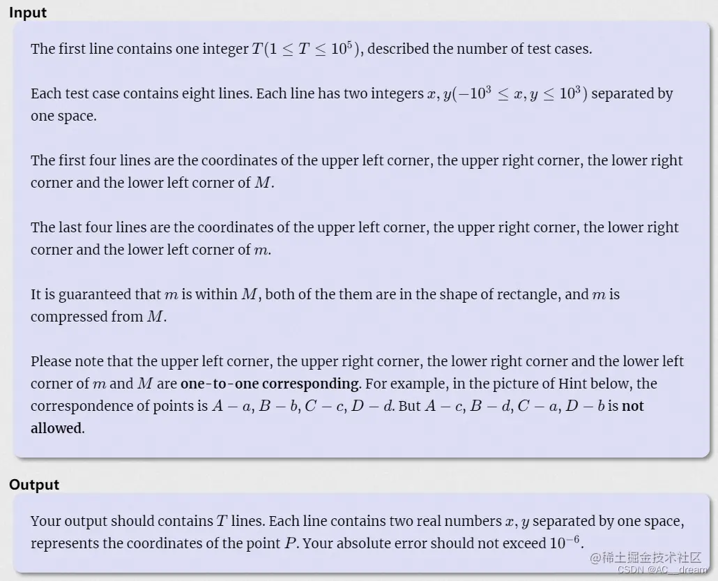 6.000000 2.000000 题意:多组数据,每组数据给出两个矩形,求两个矩形的不动点坐标,也就是说求一个点使得这个点相对于这两个矩形的位置是相同的。