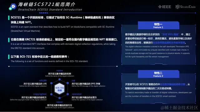 海峡链SCS721标准是一个开放的标准,它是在兼顾ERC721标准的基础上,制定的一套符合国内数字藏品规范的NFT标准接口。它具体两个显著特性: