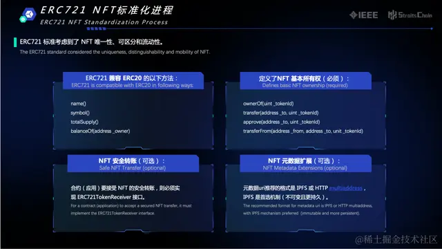 ERC721是首个NFT标准,它考虑到了NFT的唯一性、可区分和流动性的特点。其中名称、标识符、总量等方法与ERC20兼容,定义了NFT基本所有权,同时还提供安全交易接口以及元数据扩展。